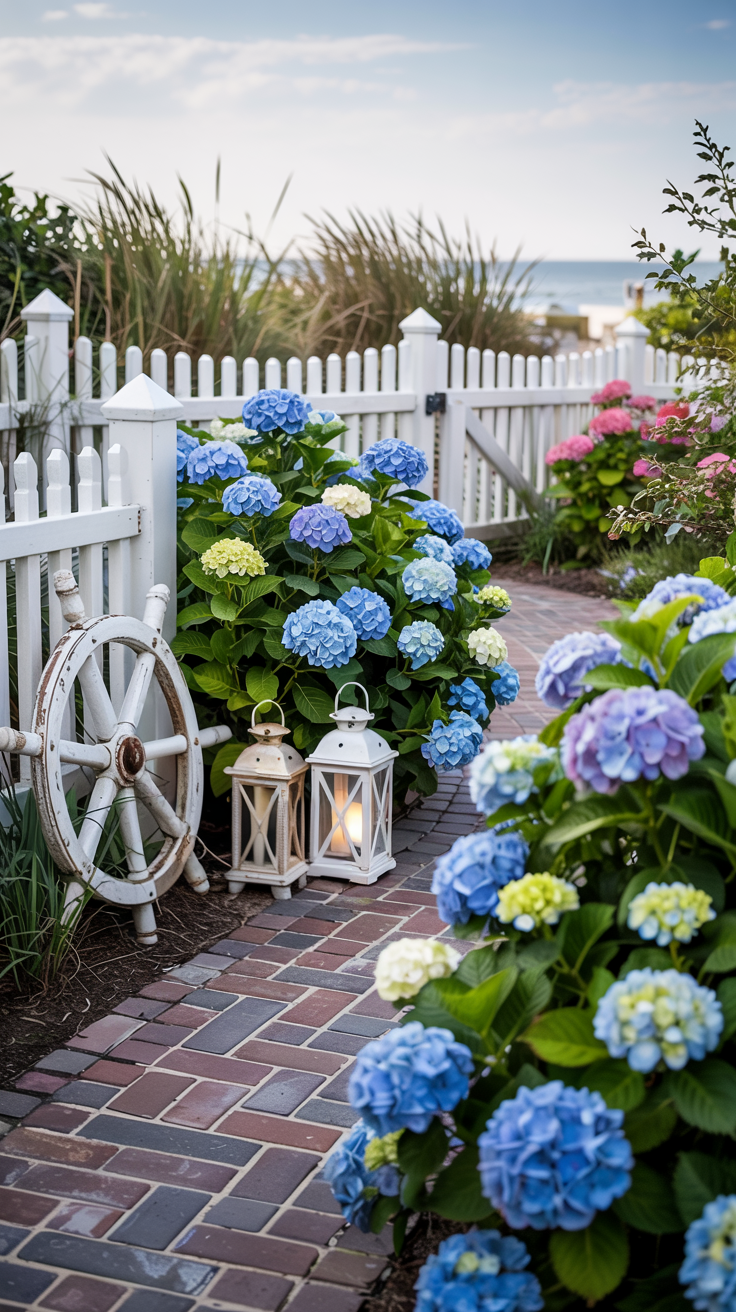 Start with a white picket fence as your foundation. Plant climbing roses or clematis to cascade over the fence and arbors. Fill beds with layers of perennials in varying heights, creating that signature cottage garden abundance. Add sandy pathways winding through the beds. Incorporate blue-flowering plants like delphiniums and hydrangeas to tie in the coastal theme.