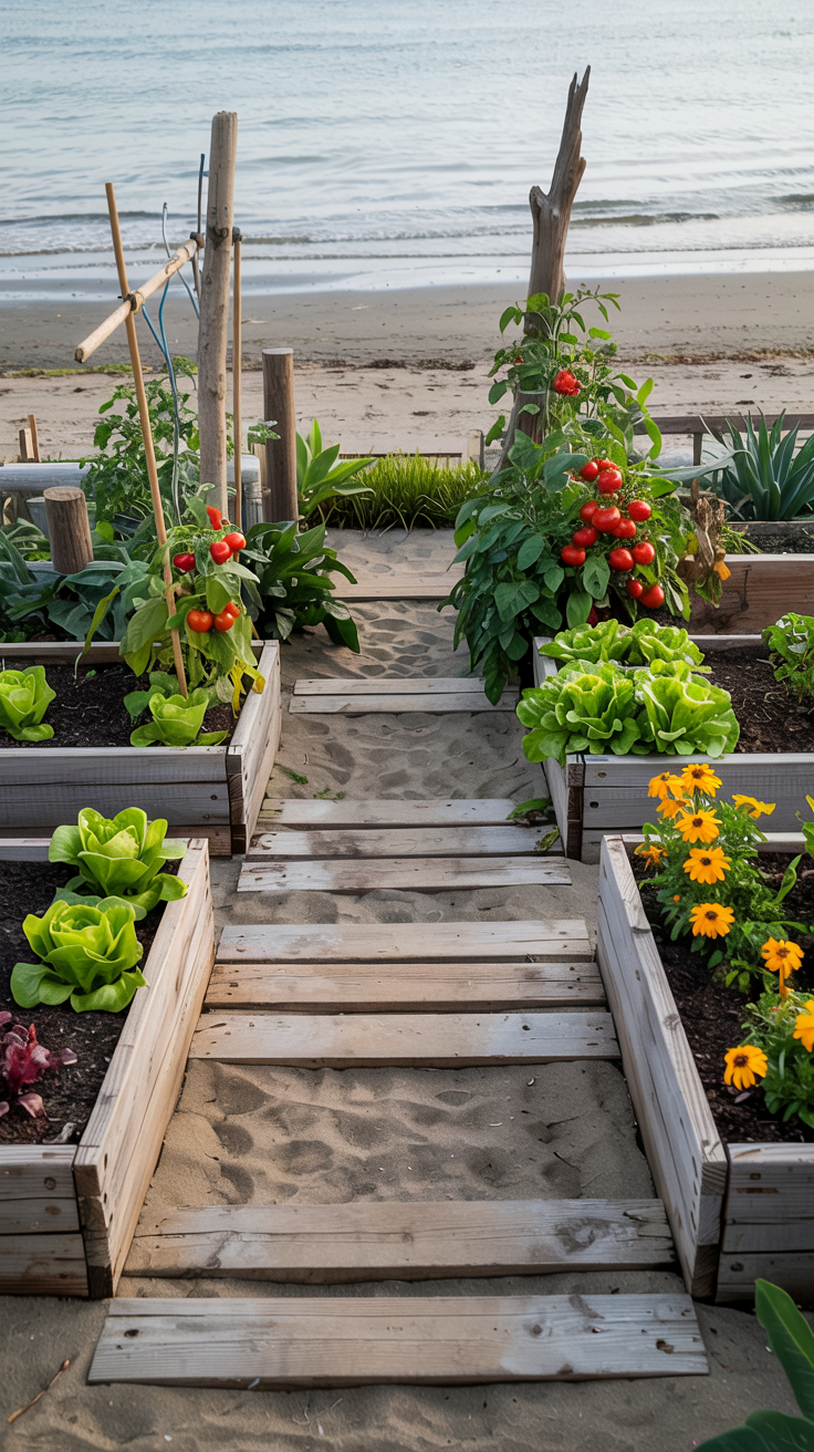 Build raised beds using reclaimed timber or cedar planks for a weathered appearance. Arrange beds in an informal layout rather than rigid rows. Create pathways using crushed shells, weathered stone, or gravel. Interplant vegetables with flowers like marigolds and nasturtiums for pest control and color. Add handmade trellises from driftwood or bamboo for climbing plants.