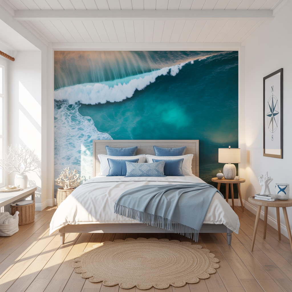Picture This: A bedroom that breathes calm and sophistication. Think crisp white walls, soft sand-inspired accents, and strategic blue touches that remind you of the ocean without feeling like a beach souvenir shop. Clean lines, minimal clutter, maximum serenity.