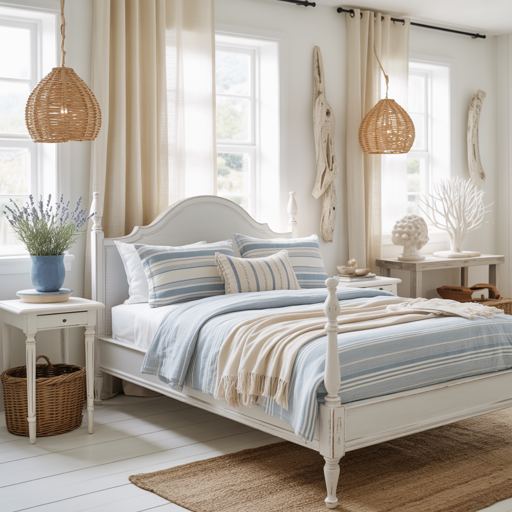 Start with your bedding and one natural texture. Swap your current bedding for something in soft whites, sandy beiges, or ocean blues, and add a single woven or jute element like a basket or rug. Those two changes alone will shift the feel of the room significantly without requiring you to repaint or replace furniture.