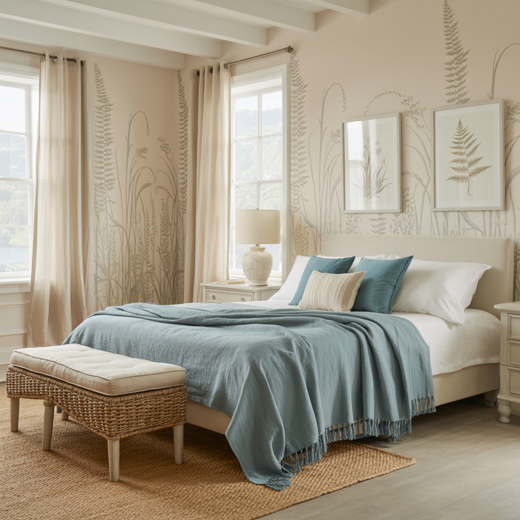 Linen and cotton for bedding, jute or seagrass for rugs, rattan or wicker for furniture accents, and driftwood or reclaimed wood for mirrors and headboards. These materials do most of the heavy lifting in a coastal room because they bring warmth, texture, and an organic quality that instantly reads as relaxed and seaside-inspired.