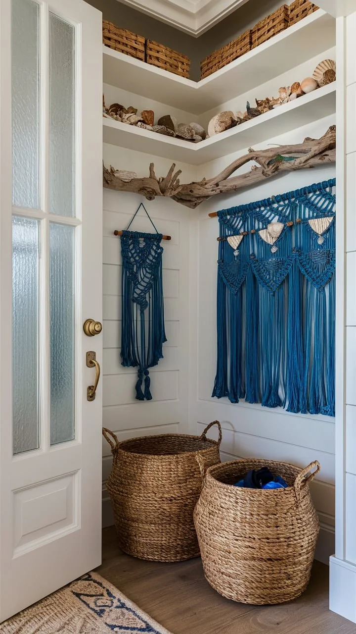 Incorporate natural textures with seagrass baskets. These versatile containers are perfect for storing shoes, umbrellas, or beach essentials.