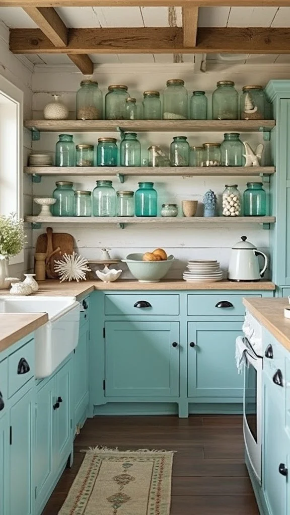 This cozy cottage kitchen shines with bright open shelving, showcasing beautiful jars that resemble sea glass. The varying shades of blue and teal add a refreshing touch, reminiscent of the ocean. Each jar holds treasures, whether it’s seashells, dried flowers, or simply kitchen essentials, all adding character to the space.