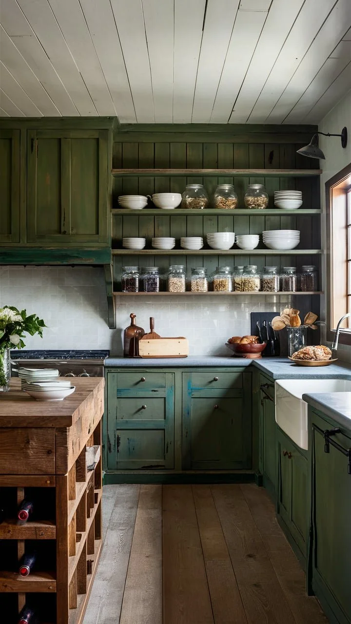 Add natural textures with woven baskets, wooden cutting boards, and maybe even a vintage rug with subtle green accents.