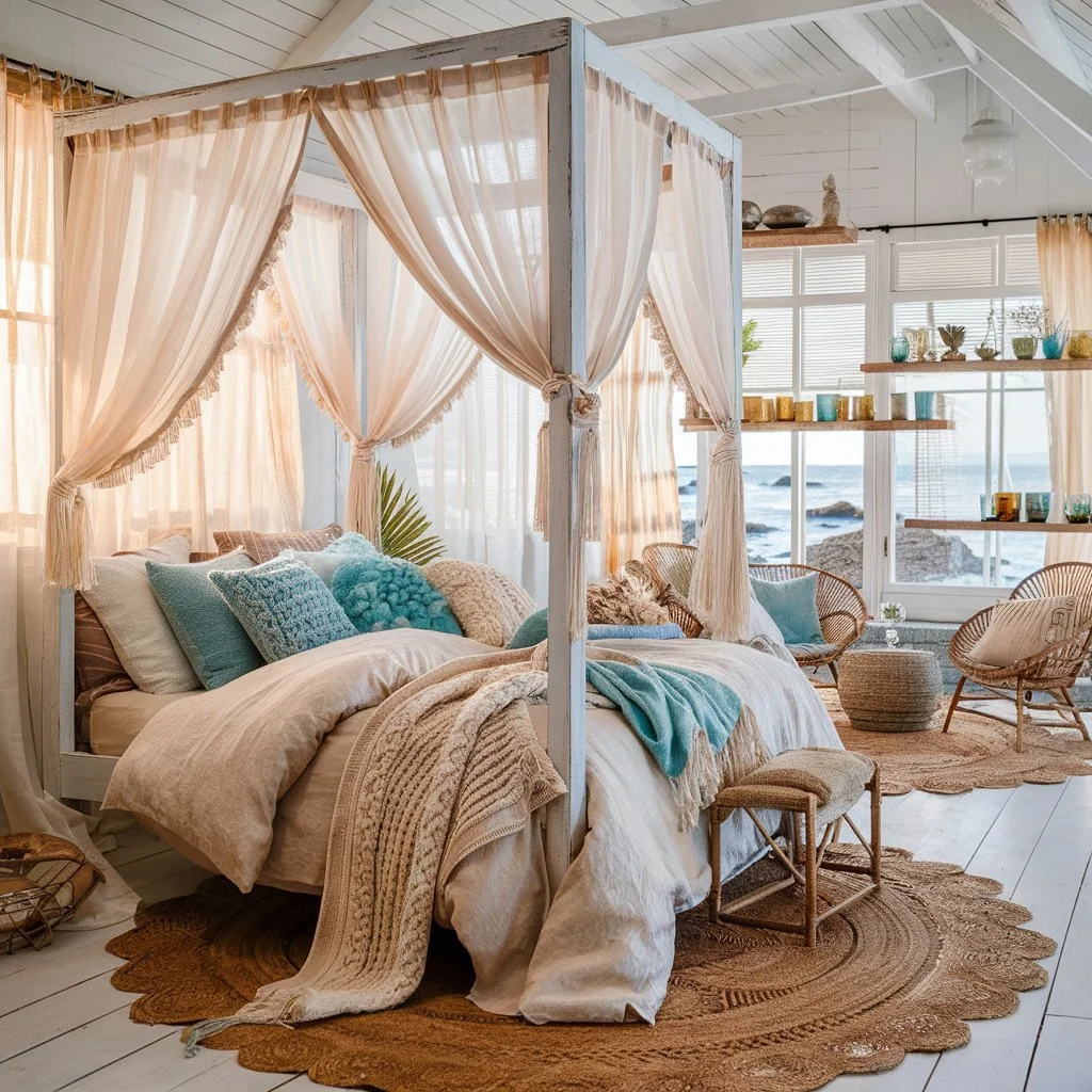 When I added a simple canopy to our bedroom, it brought this light, romantic layer that made the whole space feel like a coastal hideaway.