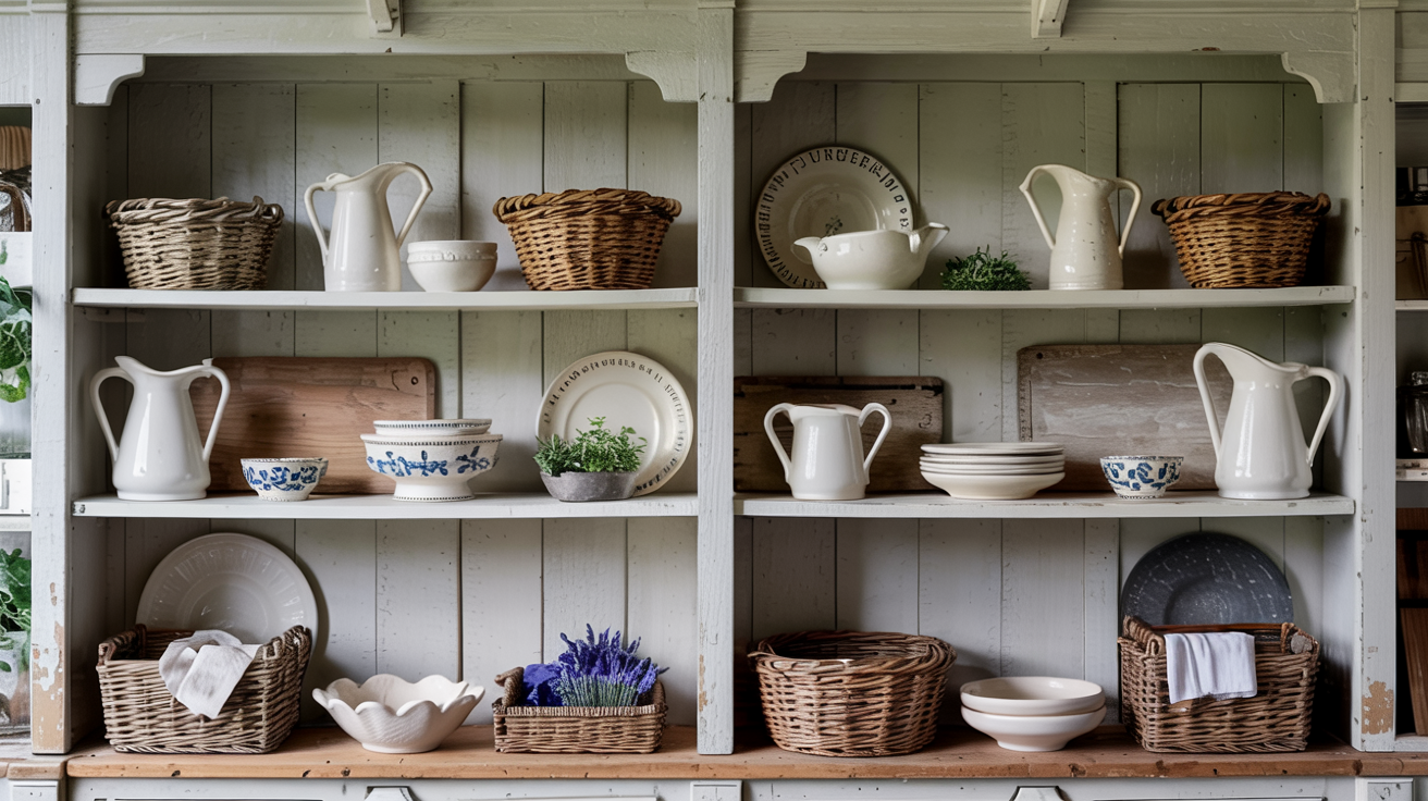 70% neutral/shared elements that work in both styles: white ironstone, wooden cutting boards, glass jars, woven baskets, fresh greenery, simple ceramic pieces