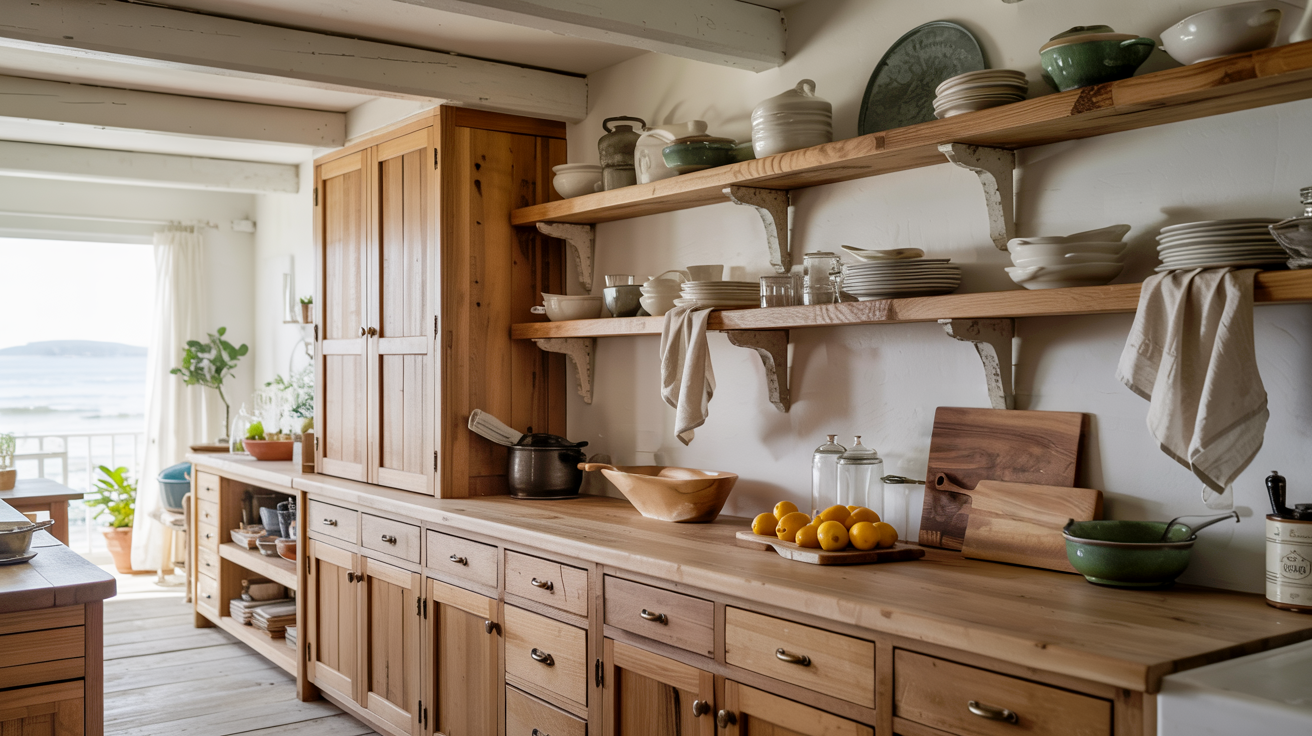 Cottage kitchens celebrate the garden. Coastal versions should reference both garden and shore.