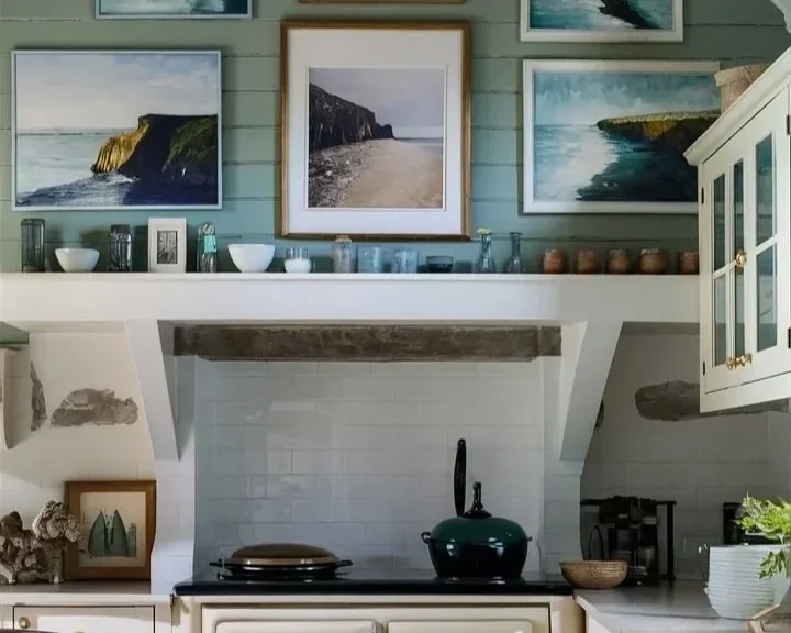 How to use them: Paint your Shaker cabinets in whites or soft grays (cottage structure, coastal brightness). Add your adapted cottage colors through an island painted in muted blue-green, open shelving backing, or interior cabinet color that peeks through glass doors.