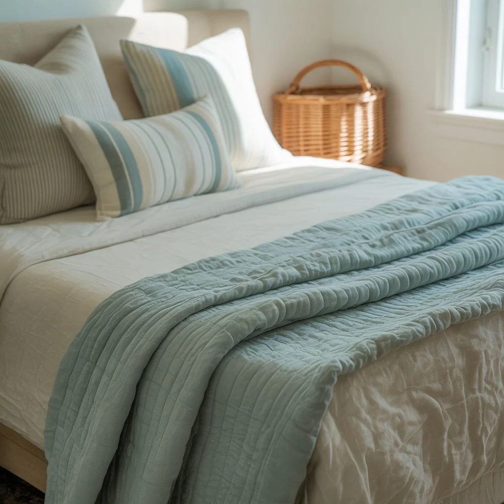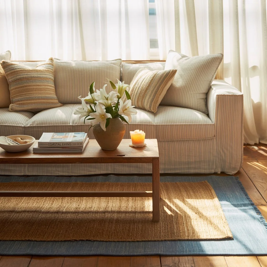Imagine walking into a living room with warm oak floors, a large jute rug layered with a smaller blue cotton flatweave. The sofa is upholstered in natural linen with accent pillows in varying textures; some with subtle blue stripes, others in woven cream. Gauzy white curtains billow slightly with the breeze, and a chunky knit throw in seafoam drapes casually over an armchair. Nothing matches perfectly, yet everything harmonizes.