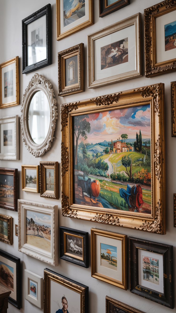 Imagine a wall filled with a vintage oil painting of a landscape, a quirky cat poster, a gold-leafed frame with no glass, and a small embroidered textile. Each piece tells a different story, but together, they create a cohesive, lived-in vibe.