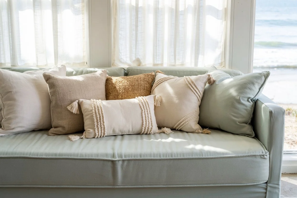 To create a visually interesting arrangement, mix various textures such as linen, cotton, and jute. You can also incorporate natural materials like burlap or canvas for a rustic beach house vibe. Try pairing a linen pillow with a more textured jute one, or layer a soft cotton pillow with a rougher, rustic fabric. The key is to create contrast through fabric types without overpowering the eye.