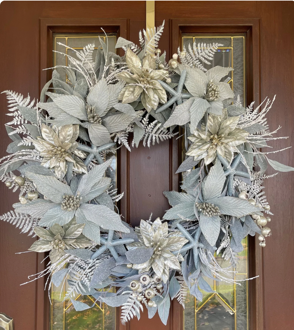 Winter Wreath Luxury Color Palette: Silver, white, icy blue, and natural weathered wood create sophisticated winter coastal front door appeal.