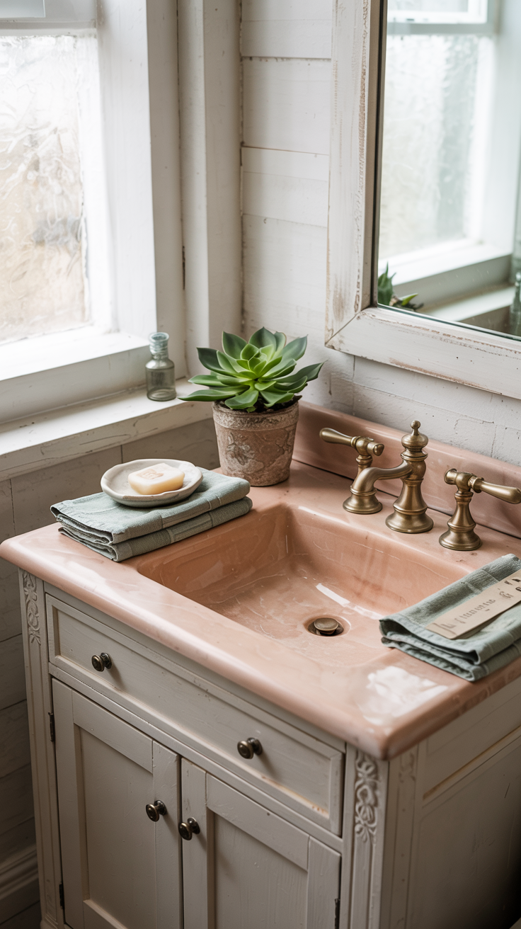 Terracotta as an accent (not an overwhelming statement). I painted our tiny bathroom vanity a muted terracotta and paired it with sage green hand towels. The combination feels both current and timeless, like it's always belonged in the cottage.
